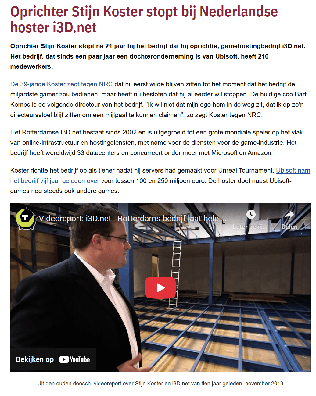 "Oprichter Stijn Koster stopt bij Nederlandse hoster i3D.net"